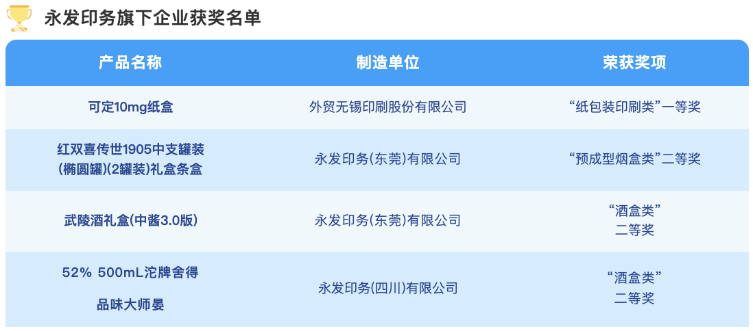 永發(fā)印務(wù)旗下3家企業(yè)斬獲4項(xiàng)行業(yè)獎(jiǎng)項(xiàng),充分彰顯了永發(fā)印務(wù)在藥包、煙包、酒包領(lǐng)域的設(shè)計(jì)及制造實(shí)力,更為公司在市場(chǎng)上贏得了更多的關(guān)注與贊譽(yù)。